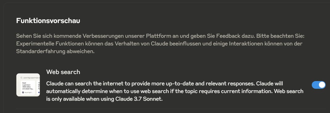 Die Web-Suchfunktion ist aktuell als Vorschau für zahlende Claude-Nutzer in den USA oder per VPN verfügbar. Eine Ausweitung auf weitere Länder und kostenlose Nutzer ist geplant. Die Funktion kann in den Profileinstellungen aktiviert werden (s.o.).