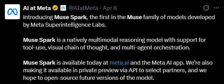 Meta stellt mit Muse Spark das erste Modell seiner neuen Meta Superintelligence Labs vor und beschreibt es als Schritt hin zu „personal superintelligence“. Das Modell soll laut Meta nativ multimodal sein, Tool-Nutzung, visuelles Denken und Multi-Agenten-Workflows unterstützen und bereits die Meta AI App sowie meta.ai antreiben. Das Unternehmen betont Fortschritte bei Reasoning, Gesundheit und Effizienz sowie einen geplanten „Contemplating“-Modus für komplexere Aufgaben.
