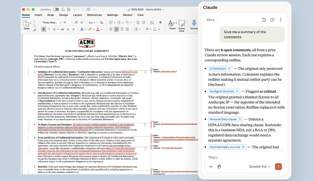 Anthropic stellt mit Claude for Word ein Beta-Add-in vor, das Claude direkt in Microsoft Word integriert - speziell für Profis in Recht, Finanzen und Editing. Es ermöglicht Fragen zu Dokumenten mit Zitaten, gezielte Textbearbeitung unter Erhalt von Formatierung, Tracked Changes für Änderungen sowie Bearbeitung von Kommentaren und Vorlagenfüllung.