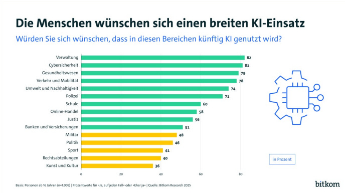 Die Nutzung generativer Künstlicher Intelligenz (KI) in Deutschland hat mit 67 % deutlich zugenommen und wird zunehmend auch am Arbeitsplatz eingesetzt. Gleichzeitig wächst die Sorge, dass Deutschland zu abhängig von US- und chinesischen Anbietern ist. Bitkom fordert daher umfangreiche Investitionen von mindestens 10 Milliarden Euro in den KI-Standort sowie die Förderung von Talenten und nationalen Rechenzentren. Ein innovationsfreundlicher Regulierungsrahmen und klare Datenschutzregelungen sind entscheidend, um die Wettbewerbsfähigkeit zu sichern. KI wird von der Mehrheit als wichtigste Zukunftstechnologie gesehen, wobei Chancen und Risiken gleichermaßen wahrgenommen werden.