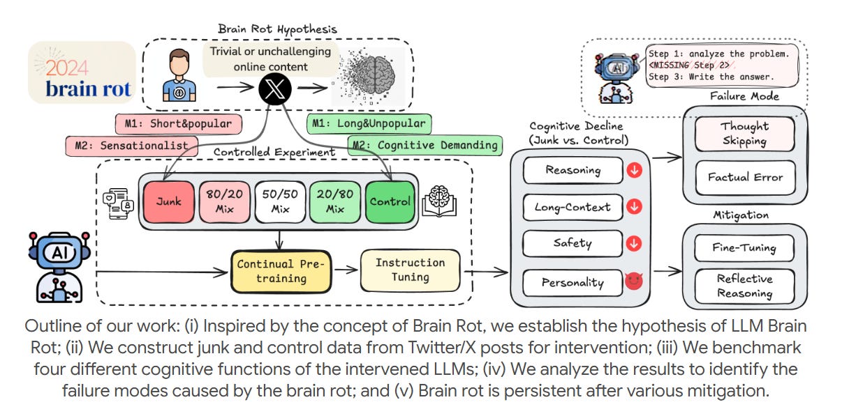Die Studie „LLMs Can Get ‘Brain Rot’!“ von Xing et al. zeigt, dass kontinuierliche Exposition von Sprachmodellen gegenüber minderwertigen, engagierten oder semantisch schwachen Webinhalten deren kognitive Fähigkeiten nachhaltig verschlechtert. Die Forschung evaluiert mit echten Twitter/X-Daten kontrolliert den Effekt von „Junk“ auf vier LLMs. Resultate belegen deutliche Abnahmen bei Reasoning, Langzeitkontextverständnis, ethischen Normen und Auftreten unerwünschter Persönlichkeitszüge, die durch konventionelles Finetuning kaum rückgängig zu machen sind. Die Autoren fordern daher eine sorgfältige Qualitätskontrolle und Selektion von Trainingsdaten als „kognitive Hygiene“ für KI-Systeme. Die Arbeit erweitert das Verständnis von Datenqualität als Trainingsrisiko für LLMs.