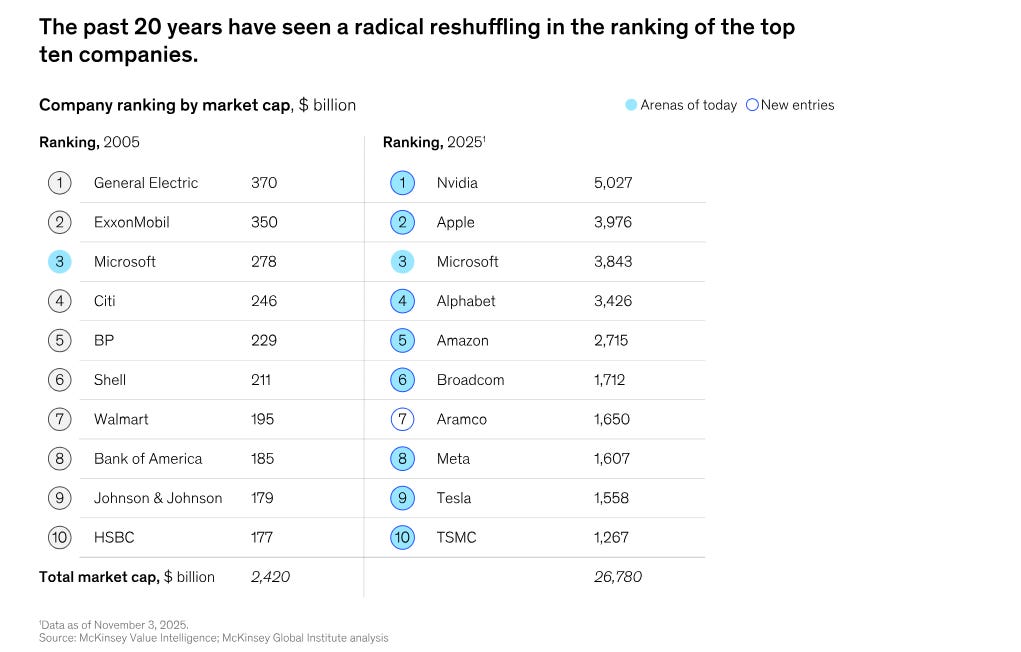 McKinsey Global Institute identifiziert in seinem Oktober-2024-Report „The next big arenas of competition“ zwölf aktuelle „Arenen“ wie Cloud-Dienste und E-Commerce, die seit 2005 ihren Marktanteil verdoppelt und dynamische Wettbewerbe mit hohen R&D-Investitionen geprägt haben. Diese entstehen durch Technologie-Breakthroughs, esklierende Investitionen und große Märkte. Autoren prognostizieren 18 zukünftige Arenen - von KI-Software über Space bis Robotik -, die bis 2040 Umsätze von 29 bis 48 Billionen Dollar generieren könnten, um Unternehmen und Investoren zu neuen Chancen zu führen.